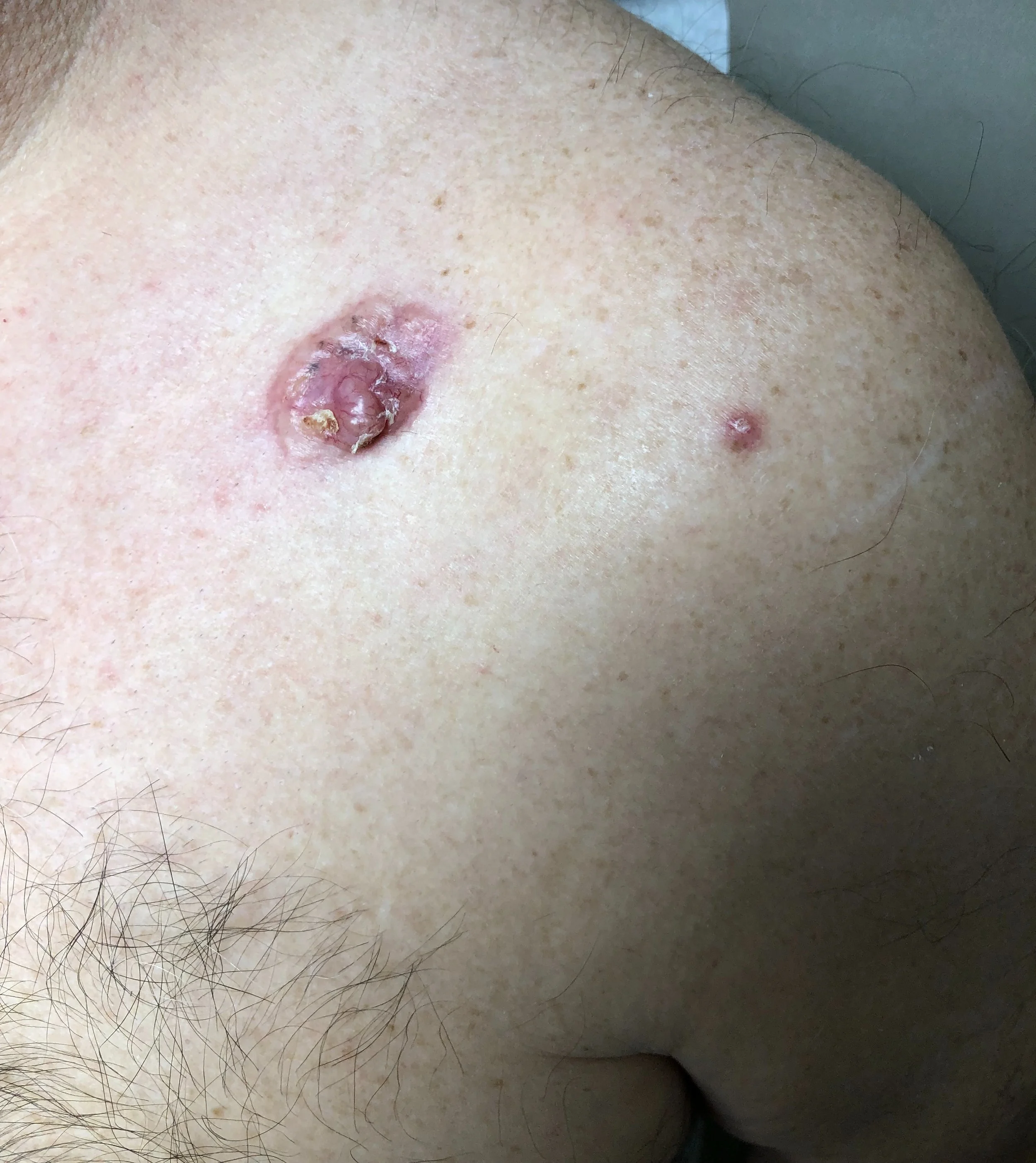Developed: Pink pearly bump with ulceration or scab (BCC 15.1).